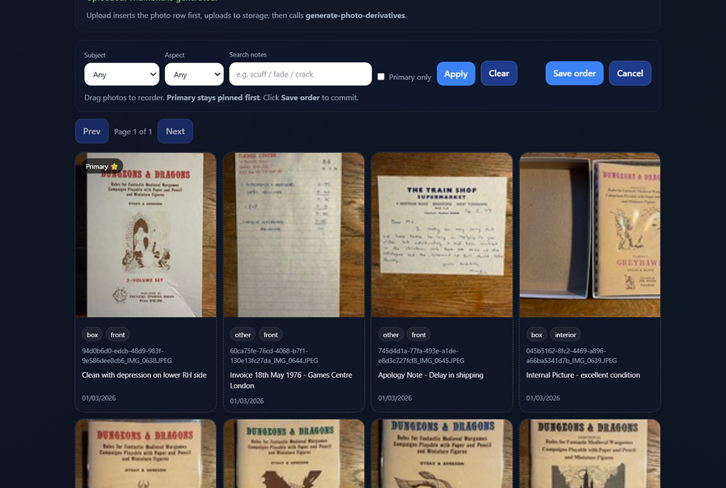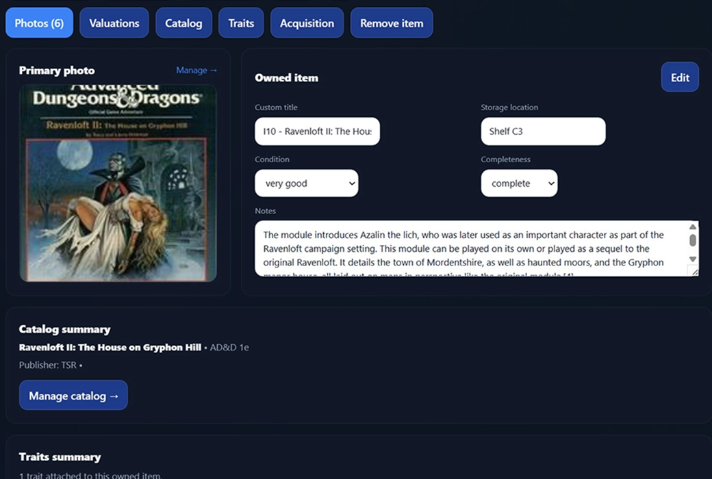 Capture what matters across your collection: printings, variants, boxed contents, condition, provenance, acquisitions, valuations, and evidence.
