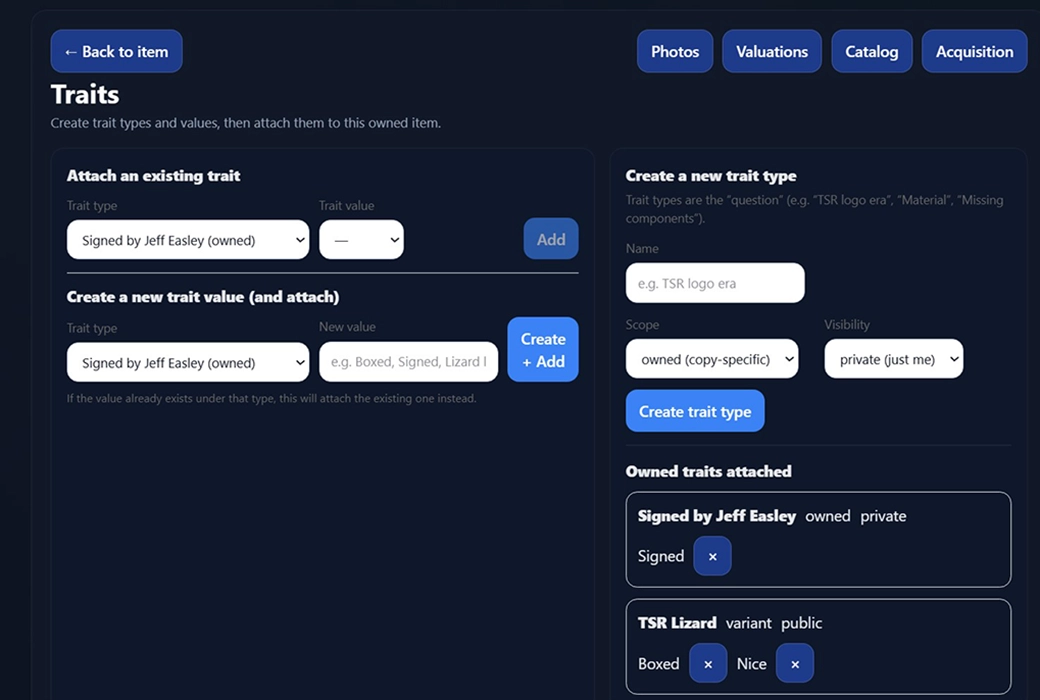 Define specific item traits and decide what stays private or contributes to the wider catalog.